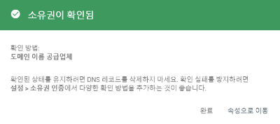 완료되면 위의 그림과 같이 '소유권이 확인됨'이 표시됩니다.